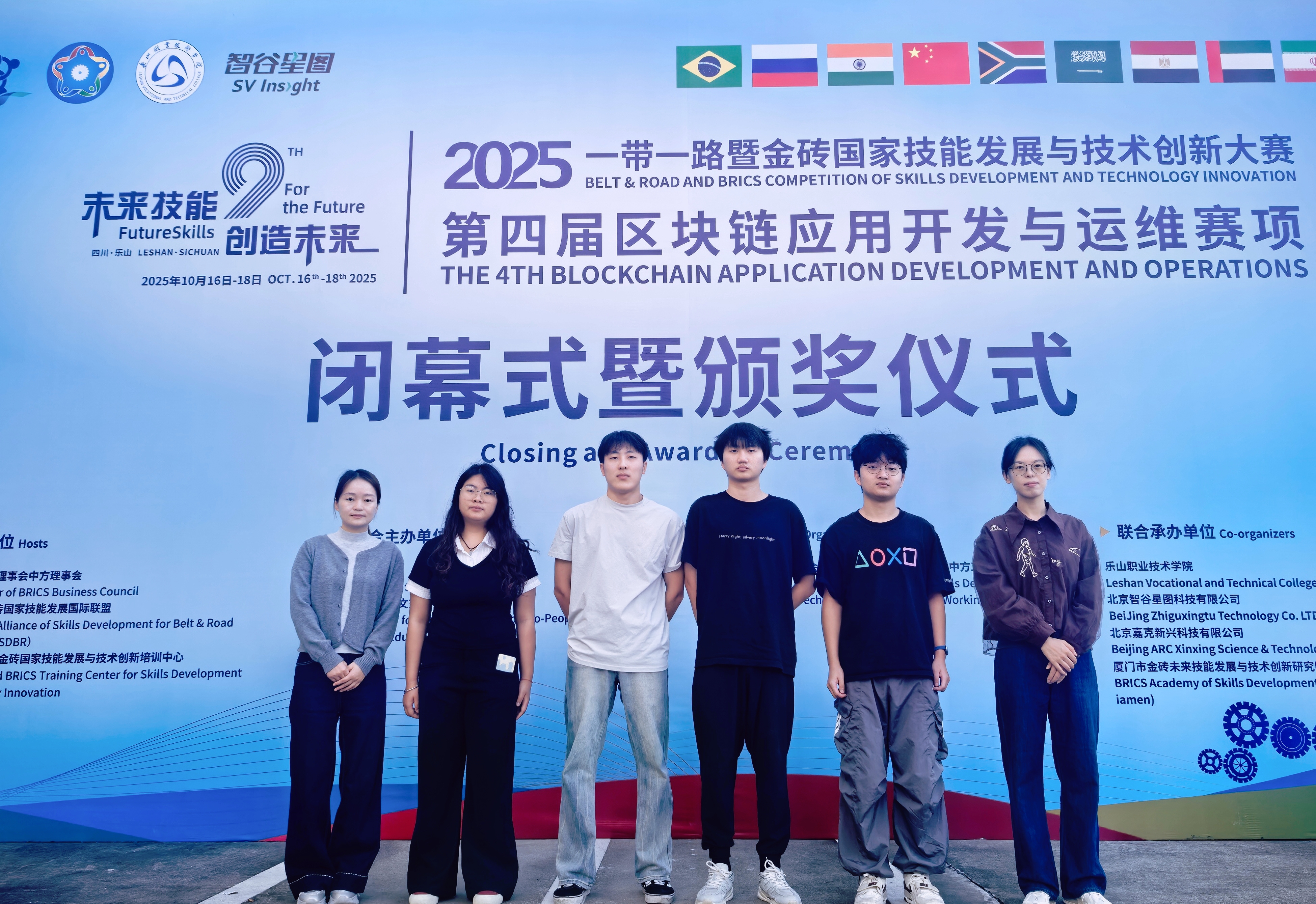 10月16日-19日,2025“一带一路”暨金砖国家技能发展与技术创新大赛之第三届区块链应用开发与运维赛项在乐山职业技术学院举办。来自全国9支本科参赛队、140支高职参赛队展开激烈角逐,开云足球(中国)官方网站智能工程学院参赛队伍表现出色,2024级计算机应用技术专业项誉和2024级云计算技术应用专业张安宝同学荣获二等奖,开云足球(中国)官方网站获“优秀组织奖”,桂超、朱志慧老师获优秀指导教师奖。
