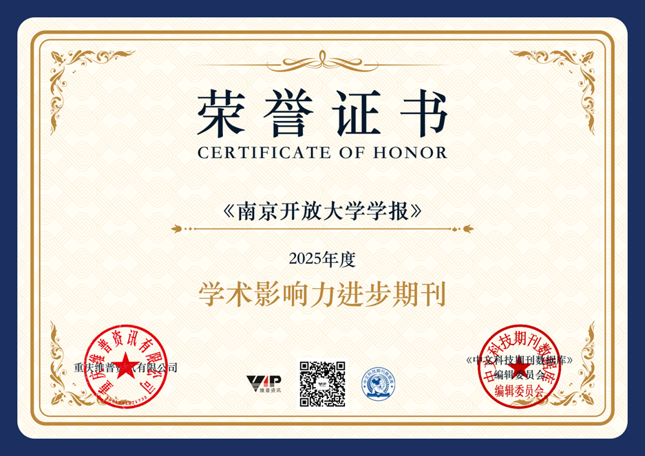 12月,在维普资讯组织的2025年度期刊评选中,《南京开放大学学报》凭借稳步提升的学术传播力、文献引用率及行业认可度,荣获“学术影响力进步期刊”称号,标志着学报在学术影响力建设上取得重要突破。